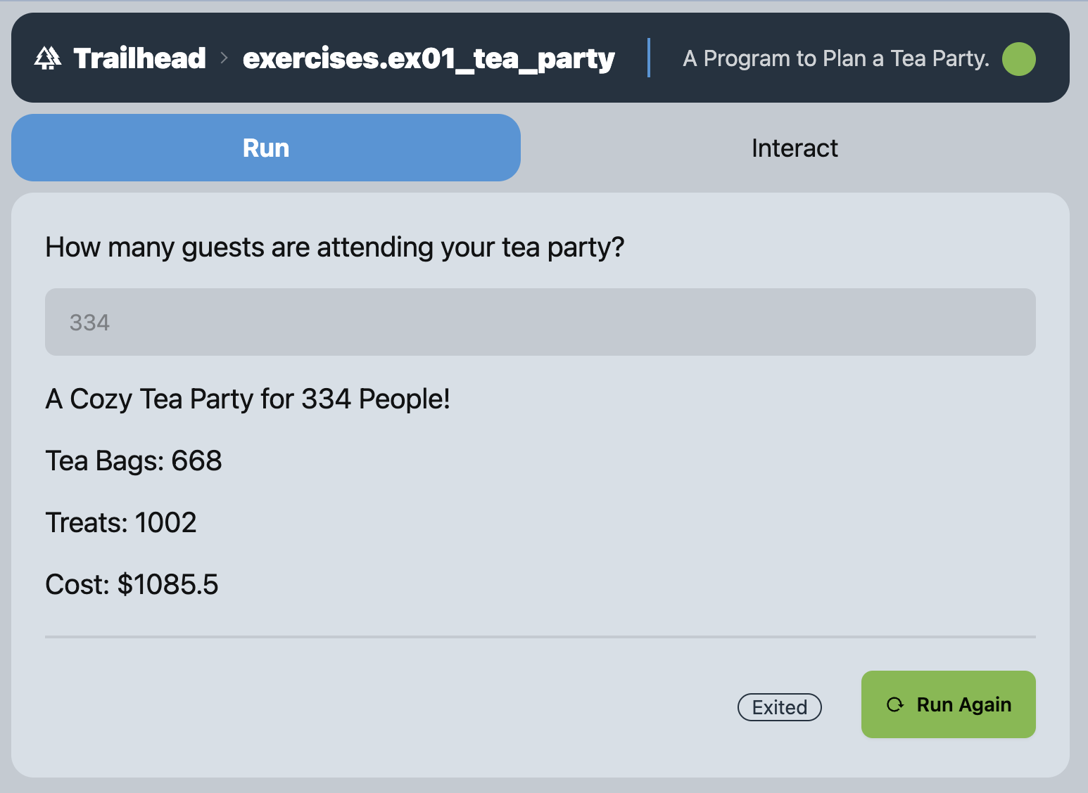 main_planner(guests=int(input("How many guests are attending your tea party? ")))After adding these lines to the end of your program, you should now be able to go to the “Run” tab of your program, be prompted for a guests count, and see the output of your program.