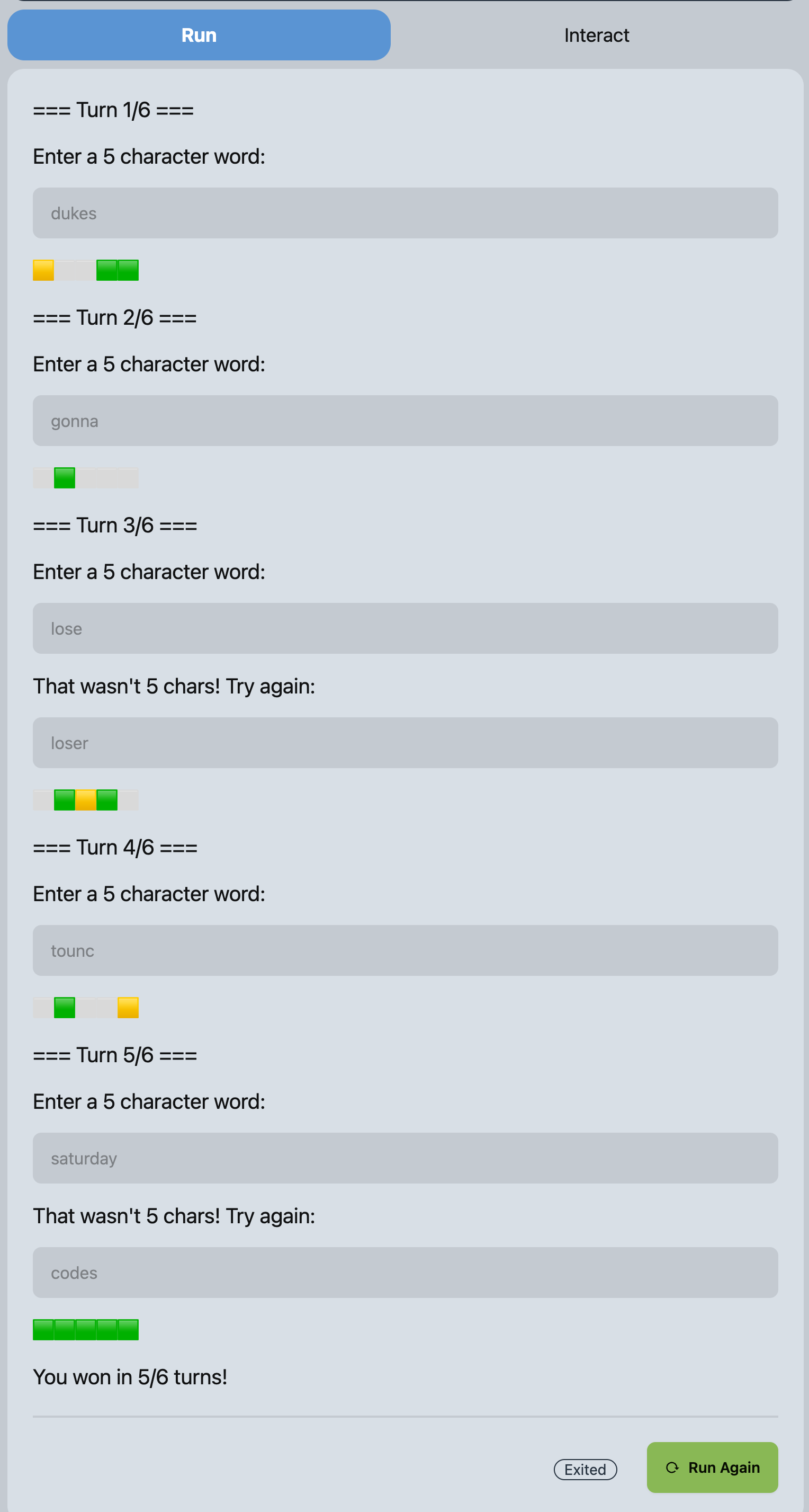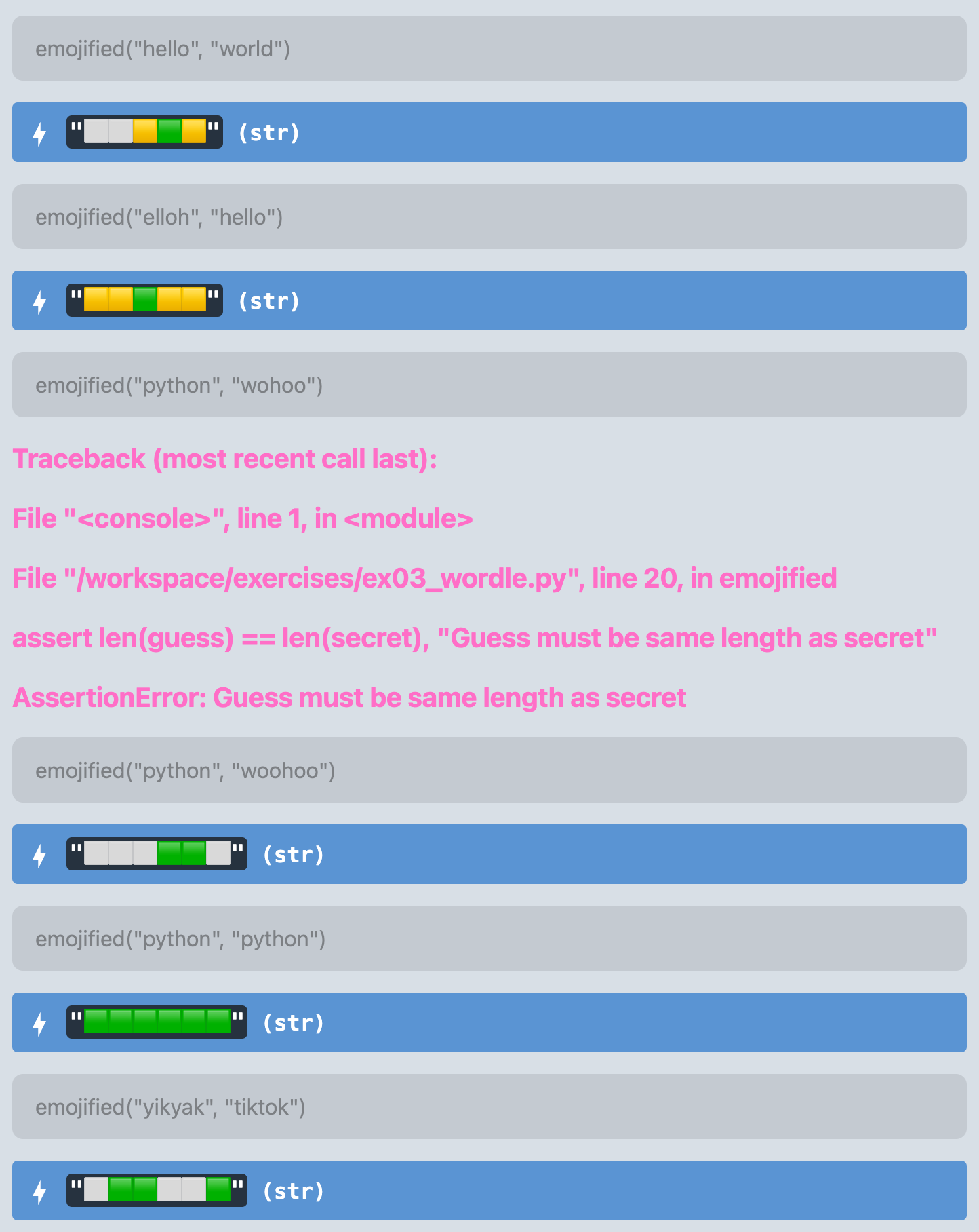 input_guessto obtain a guess of the correct length. - Codify the emoji results of the user’s guess versus the secret by making use of your