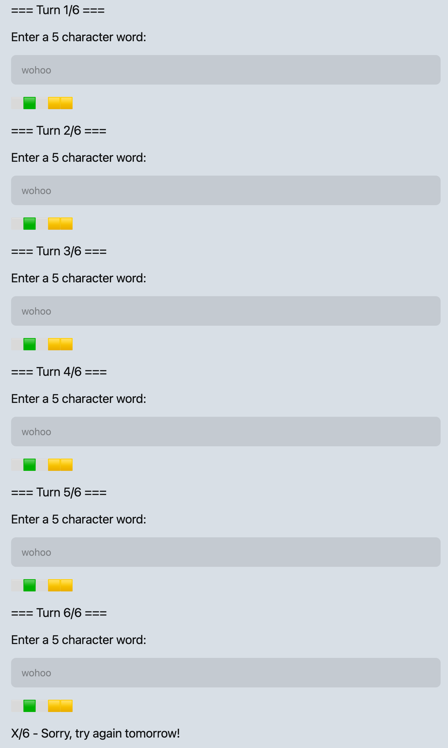 After the game loop, if the user won, print You won in N/6 turns! where N is replaced with the number of guesses it took to get the word. Otherwise, when the user does not guess the word in 6 or fewer guesses, print the following message: X/6 - Sorry, try again tomorrow! where X is literally the character X.