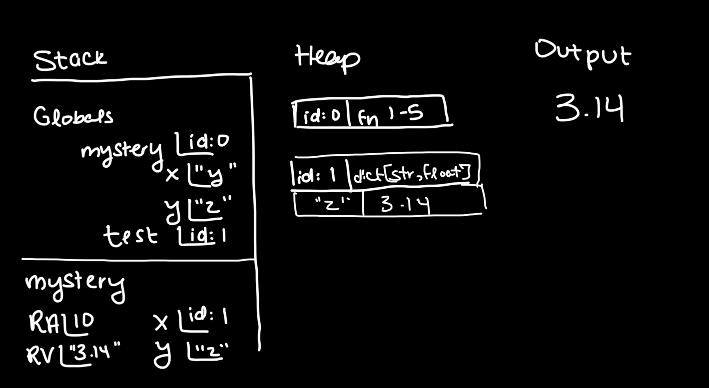 The mystery frame has: * Return Address (RA) at line 10. * Return Value (RV) is the string “3.14”. * Variable x points to the same dictionary object as test * Variable y has a value of “z”.